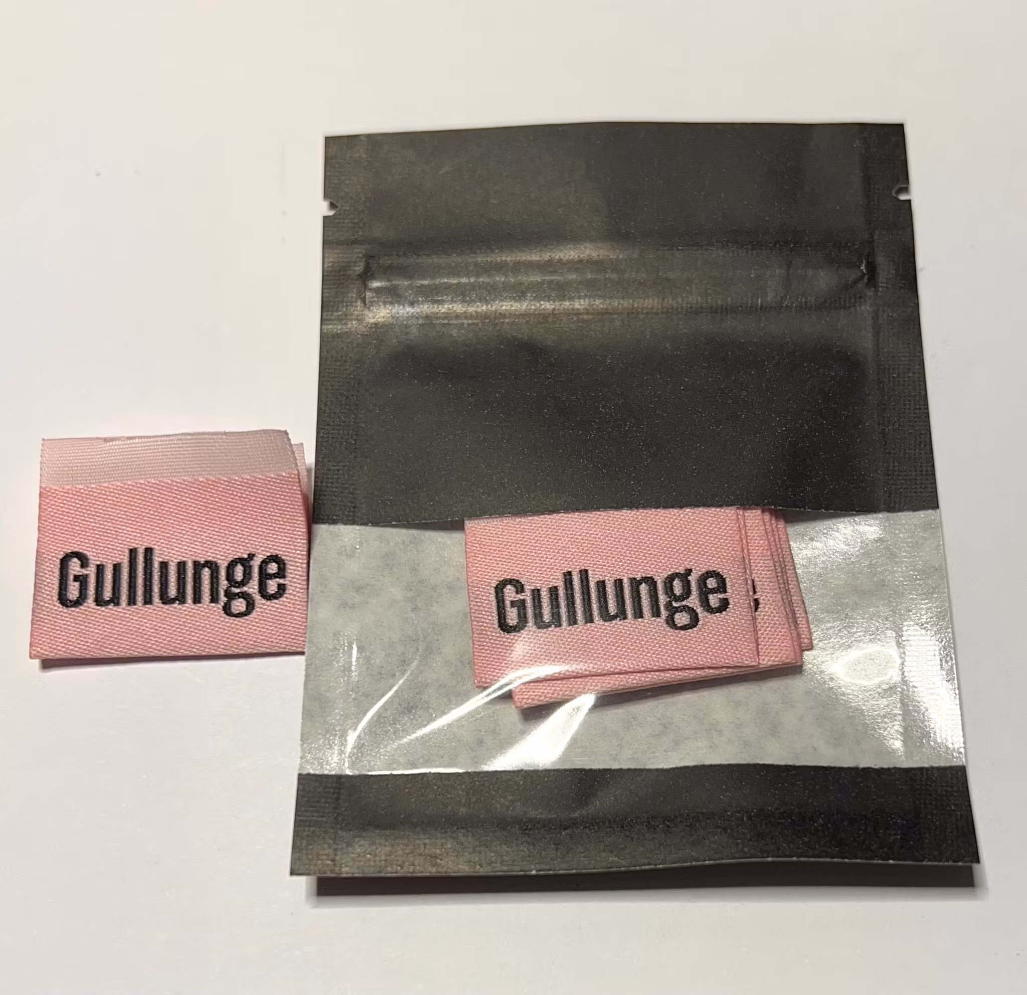 Egenprodusert og designet av Minnasydd.. Vevede labels med norsk tekst. Str er 3 cm x 2,5 cm