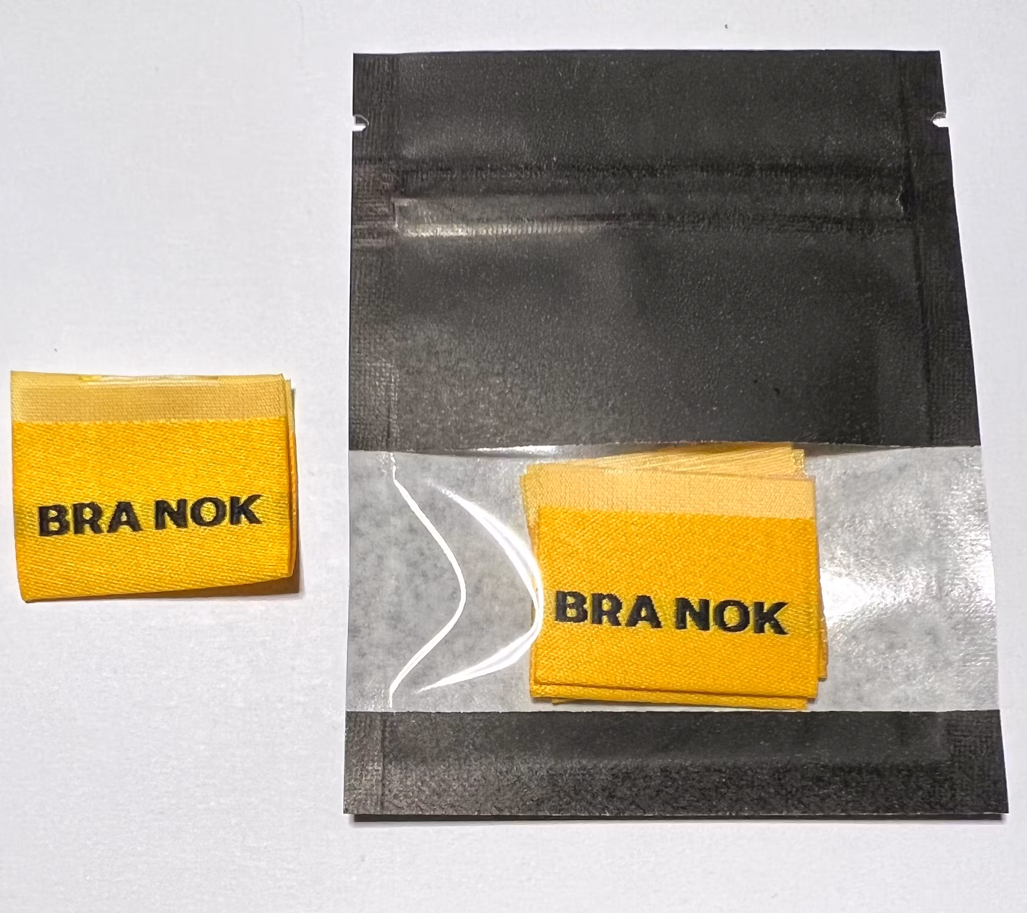 Egenprodusert og designet av Minnasydd.. Vevede labels med norsk tekst. Str er 3 cm x 2,5 cm