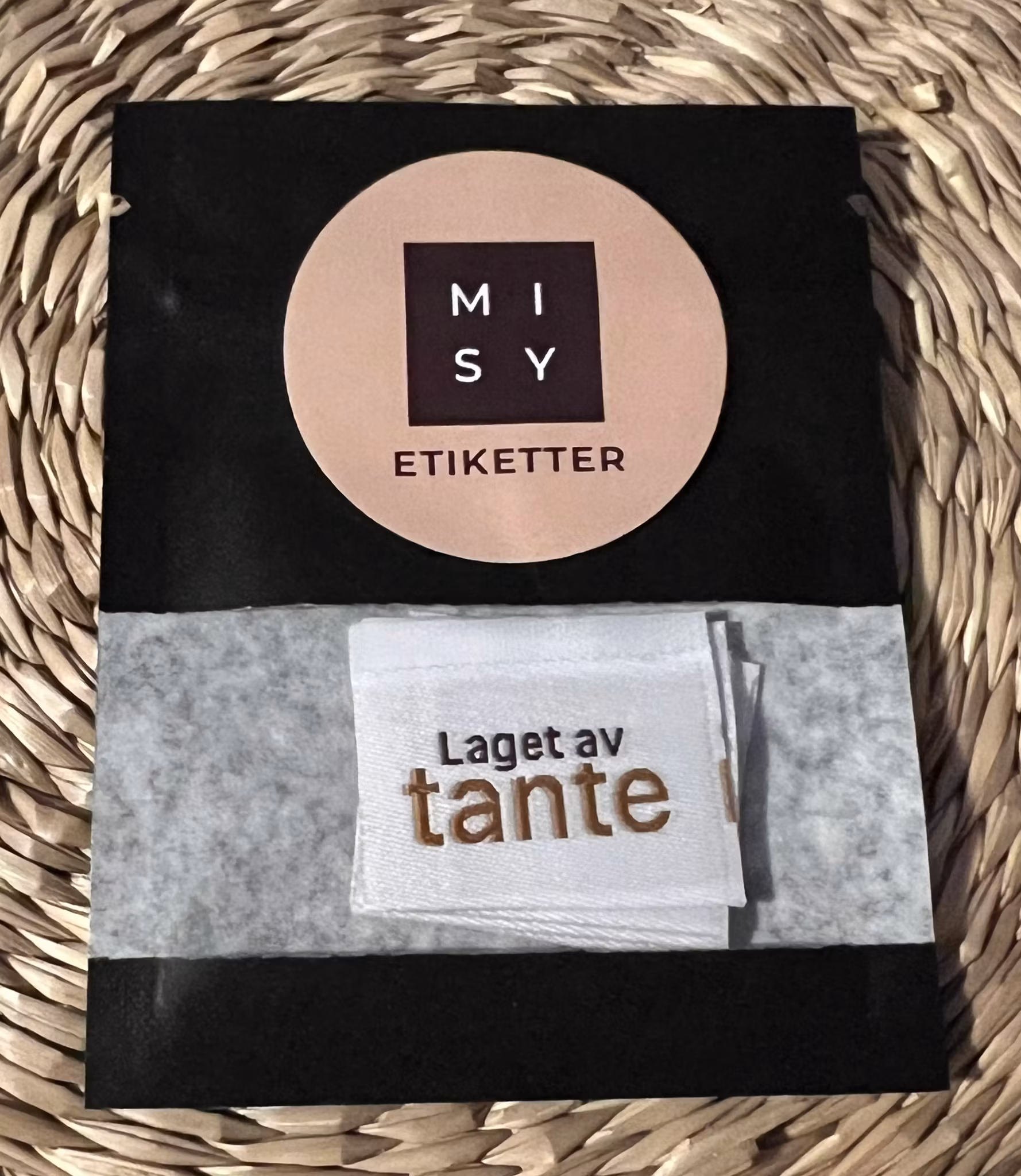 Egenprodusert og designet av Minnasydd.. Vevede labels med norsk tekst. Str er 3 cm x 2,5 cm