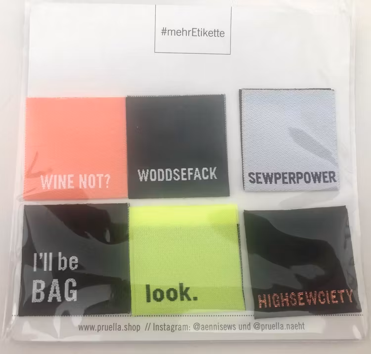 Morsomme vevede labels. Størrelse er 3x3 cm. De er doble og det er skrift på begge sider.