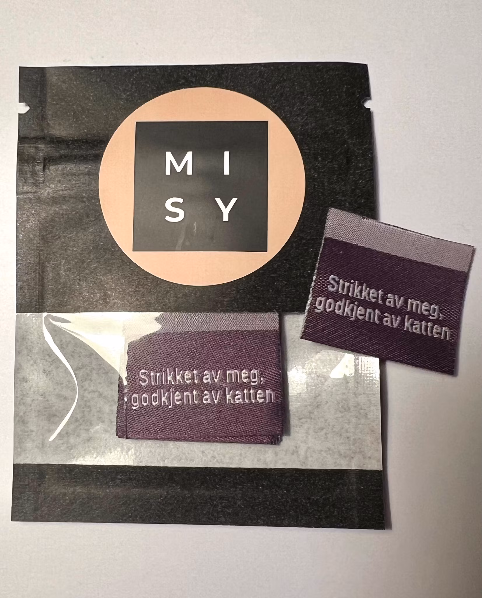 Egenprodusert og designet av Minnasydd. Vevede labels med norsk tekst. Størrelse: 3 cm x 2,5 cm. 5 like labels per pakke.