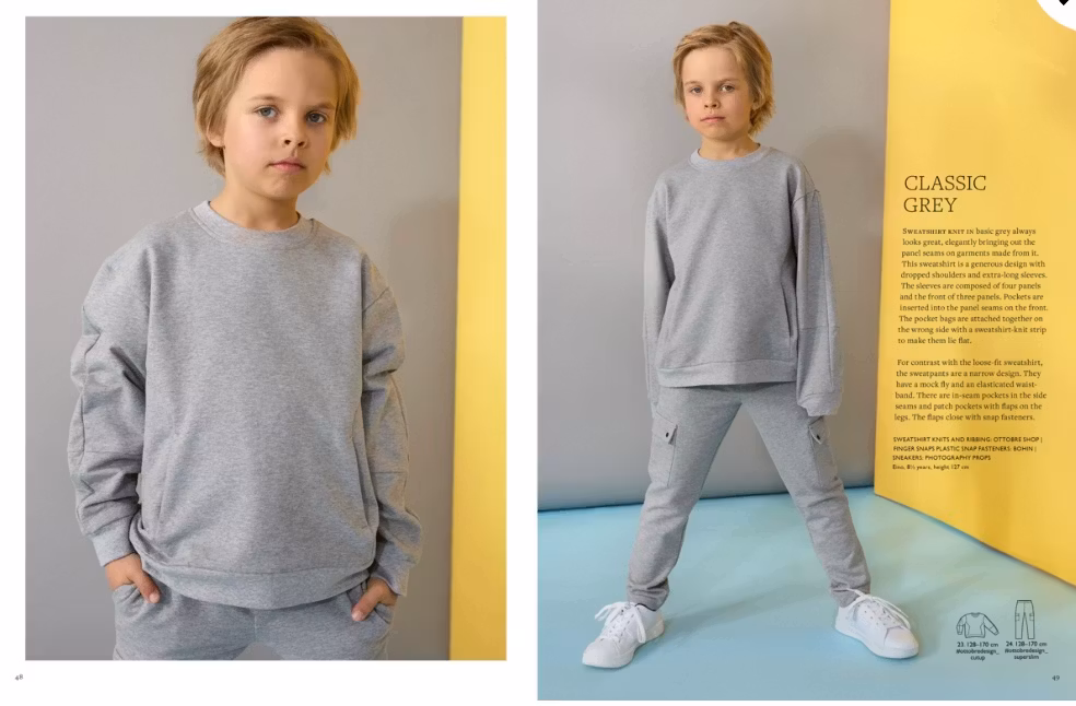Mønsterblad med klær til barn fra str 62-170